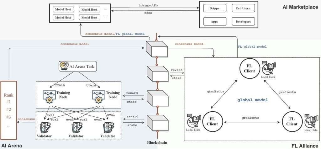 AI Arena 共识模型或FL 全域模型可以部署并托管在AI Marketplace 中,为各种应用程序提供界面。 AI Arena 训练节点、验证者和FL 用户端需要质押才能参与系统,并将根据其表现获得奖励。