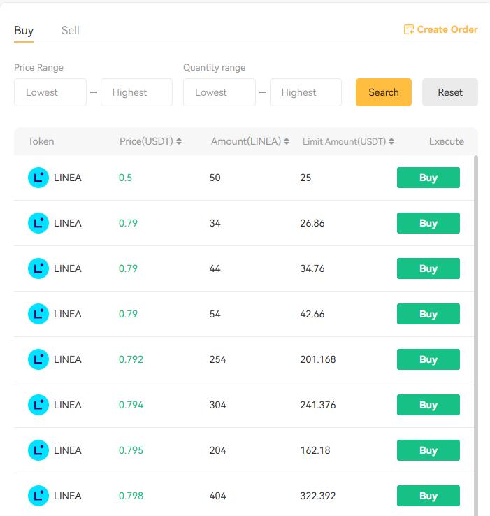 购买 LINEA:点击“购买”并输入您想要花费的 USDT 数量和您愿意支付的价格。出售 LINEA:如果您已经拥有 LINEA 代币(例如,来自空投或 o,tc),您可以按照您想要的价格列出它们。