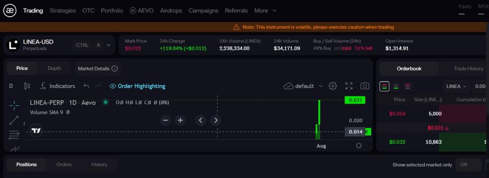 在 AEVO 上,LINEA-USD 的交易价格为 0.022 美元,在过去 24 小时内强劲上涨 119.84%--上涨 0.012 美元。