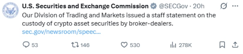 声明指出该指引是过渡性措施,SEC仍在考虑与经纪交易商加密资产证券托管相关的更广泛议题。SEC加密资产工作组持续致力于为数字资产行业多个领域提供监管明确性。