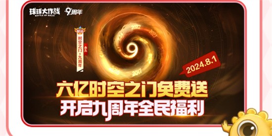 8.1当天上线,直接送永久!绝对不逼肝!九周年限定极品皮肤「时空之门」无条件送!登录游戏即可免费领取!穿上它,成为九周年最炫的球宝!