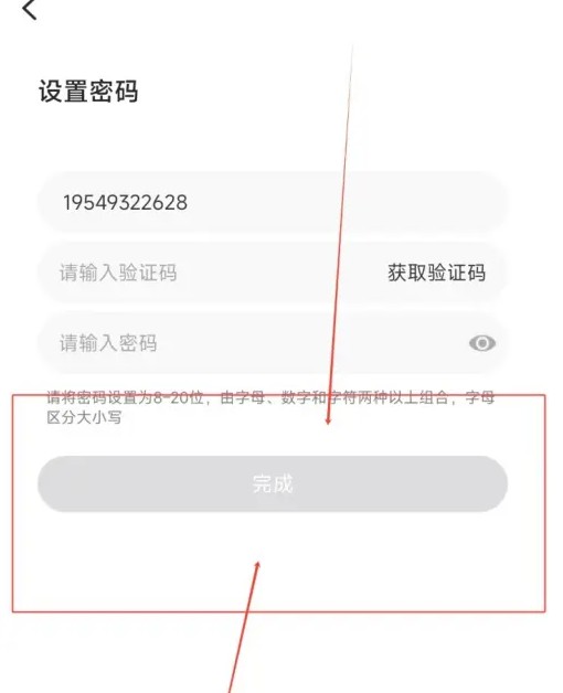 在设置界面中输入验证码和密码后,点击“完成”,即可完成设置登录密码的操作