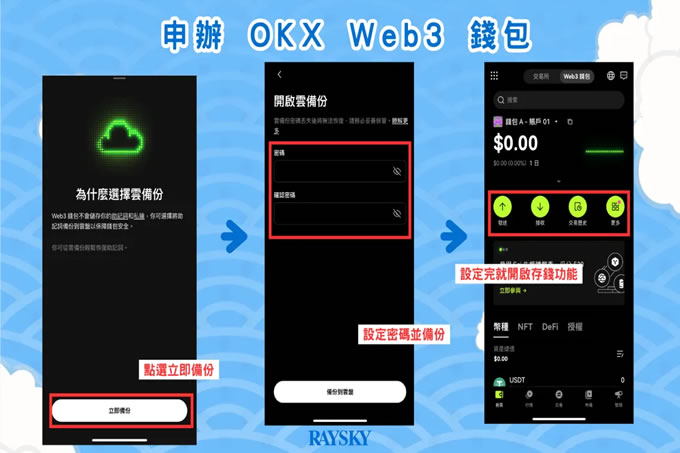 确认完密码后按下「备份到云盘」,接着你就会跳回到Web3 钱袋首页,显示出发送、接收等等功能,表示你可以开始使用OKX Web3 钱袋了。
