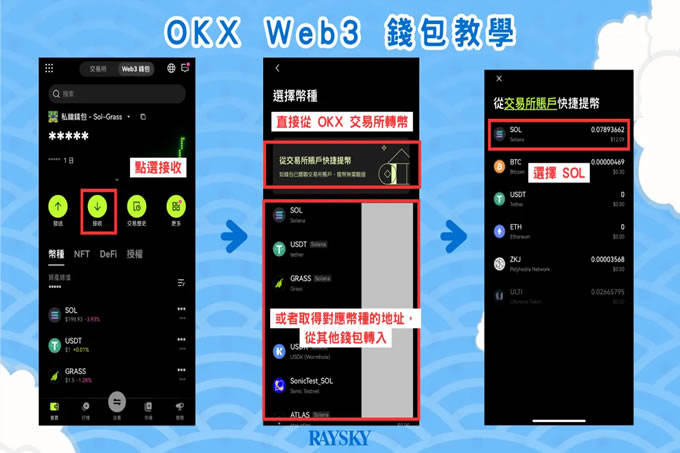 点击钱袋首页的「接收」选择你要存入的币种,就会出现这个币在你钱袋的地址从其他钱袋或交易所帐户,将币转入这个地址中,就完成入晶了如果你的OKX 交易所帐户,有要存入的币种,可以直接点击「从交易所帐户快捷提币」,轻松将资金转入Web3 钱袋,如下图示范。