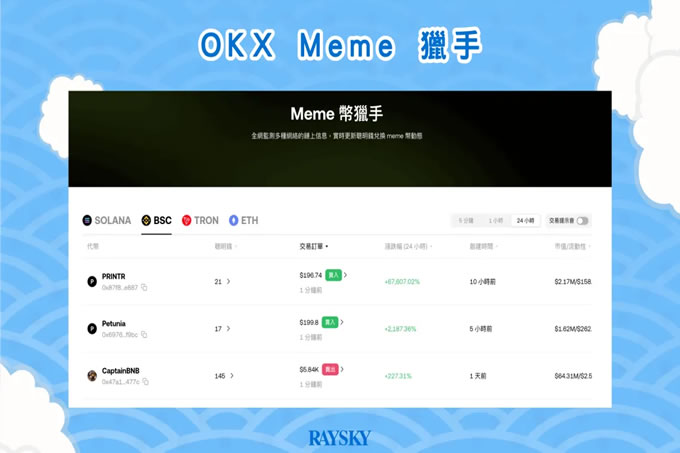 另外,OKX Web3 网页版还有「MEME 币猎手」专区,专门监控各大主流区块链(包括Solana、Ethereum、BSC 等)上的Meme 交易动态