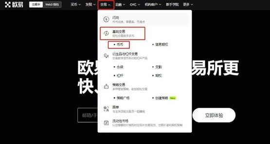4、登陆完回到首页,点击交易-基础交易-币币,进入交易页面。