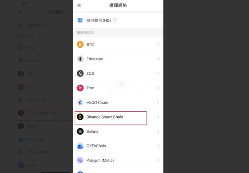 3、点击BSC链,提示创建或导入,输入钱袋名和密码