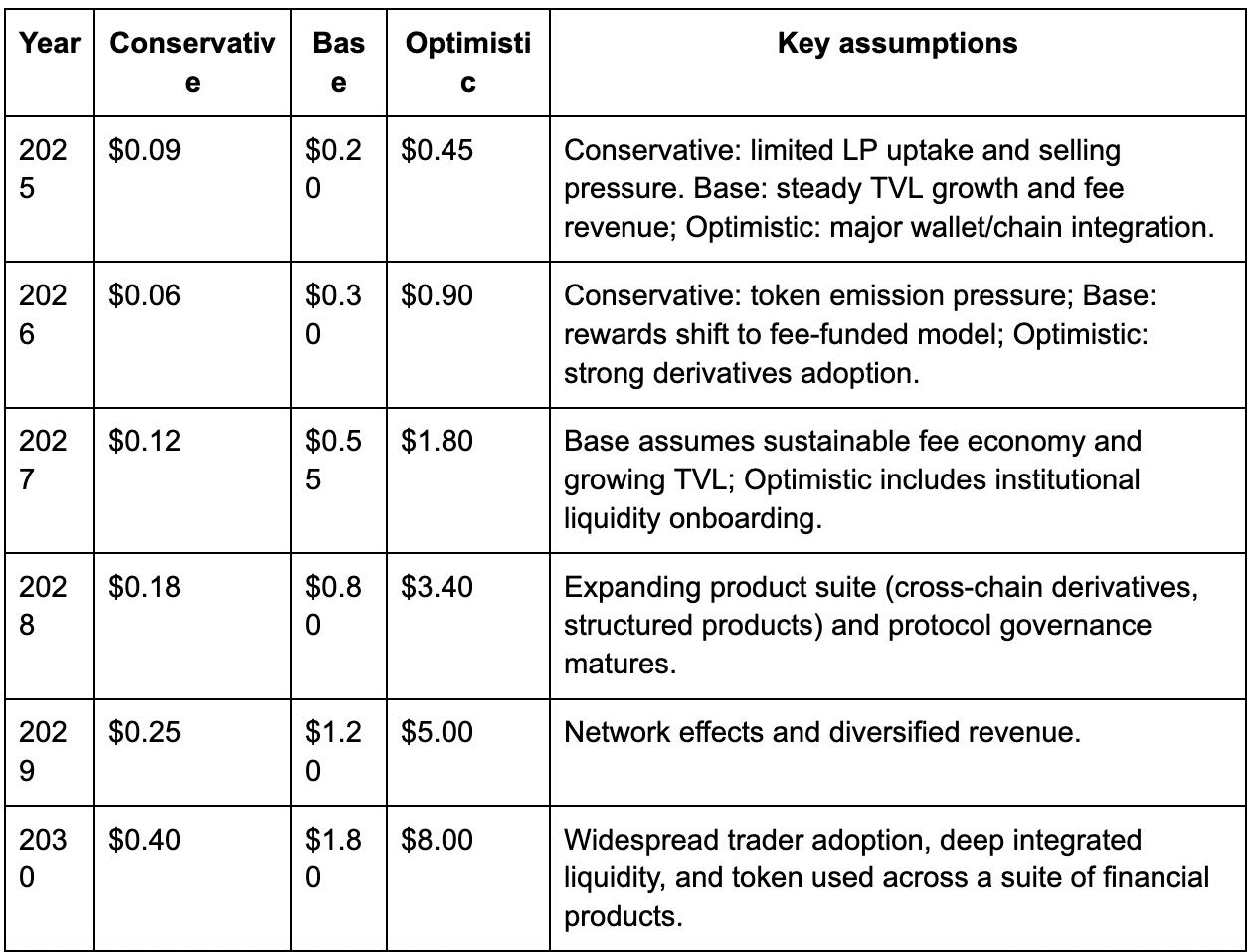 下表概述了基于采用速度、代币供应动态和更广泛市场情绪的条件性价格区间。这些不是预测,而是勾勒可能性的场景框架。