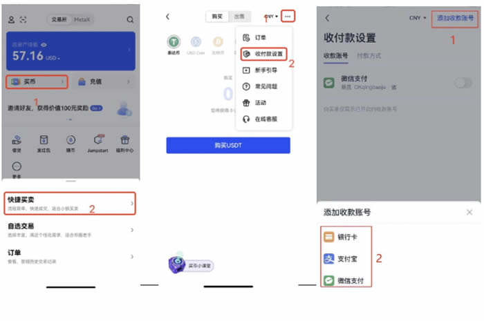 打开欧易APP首页,点击【买币】-【快捷买卖】-右上角【更多】图标-【收付款设置】-【添加收款账号】,选择相应的储蓄卡/支付宝/微信支付进行设置即可。