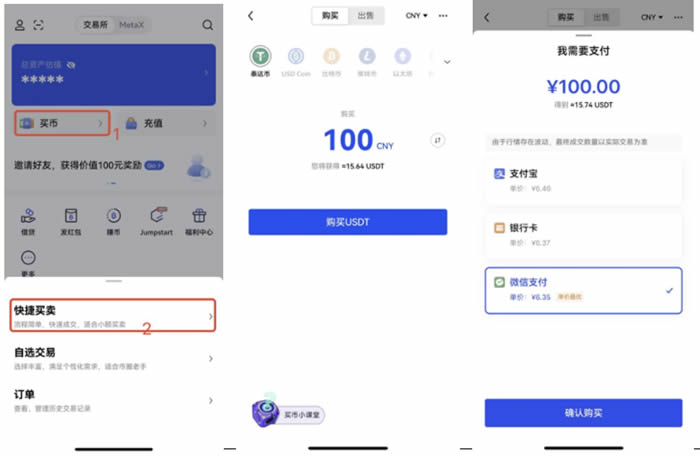 打开欧易APP首页,点击【买币】-【快捷买卖】-【购买】-输入【购买金额】或者要买的【币种数量】-【购买USDT】-选择支付方式-【确认购买】。