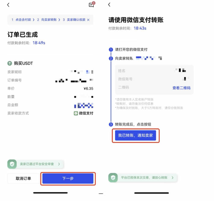 订单确认之后,点击【下一步】;及时打开手机银航APP/支付宝/微信,输入对方账户信息进行付款,完成之后,点击【我已转账,通知卖家】。对方核实款项后,您所购买的数字资产就会发放给您,可以在【资产】栏查看。