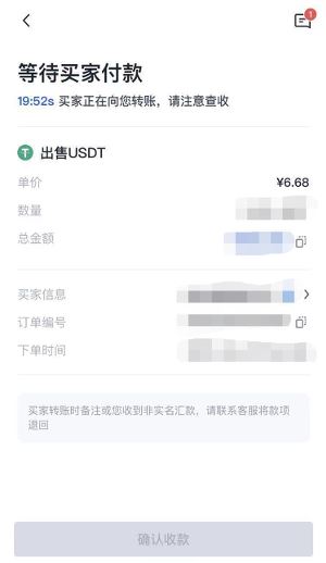点击【确认出售】,等待买家付款,待确认收款点亮后即表示对方已付款,请及时查看钱款到账情况,请务必登录手机银航或网银查看到账情况,确认钱款到账后输入资金密码,然后尽快点击【确认收款】将数字资产发放给买家即可。