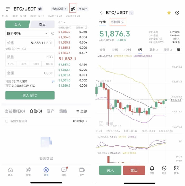 币对挂单信息查看:【买入/卖出】页面右边是交易深度页面,可以在页面中看到买入和卖出的挂单情况,上方红色区域是卖盘,下方绿色区域是买盘。