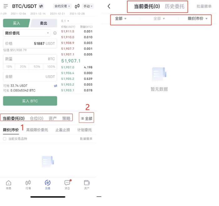 例如在【当前委托】页面点击【全部】按钮,可以查看您的【当前委托】(即当前没有成交的挂单)、【历史委托】(即已经成交和已撤销没成交的委托单子),委托单里可以详细看到您的委托时间,币对和成交量等信息。