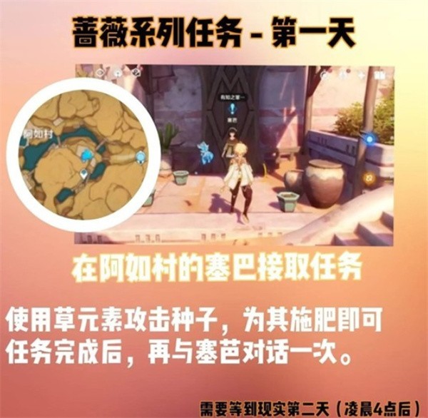与赛芭对话,提交1朵须弥蔷薇,获得种子后使用草元素施肥