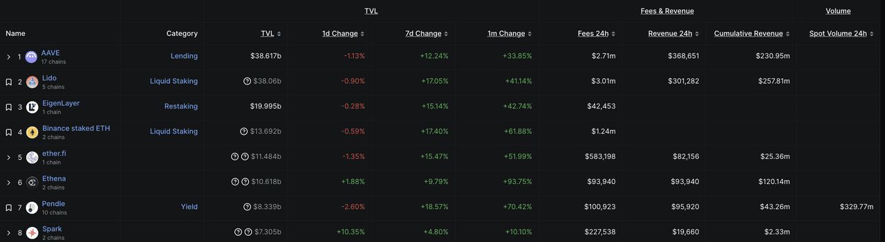 Ethena 在过去一个月内创造了 5,000 万美元的手续费收入与 1,000 万美元的协议收入,在所有 DeFi 协议中月度手续费收入排名第六。其锁仓总价值(TVL)现达 94.7 亿美元,使其成为以太坊与整个 DeFi 市场中第六大协议。