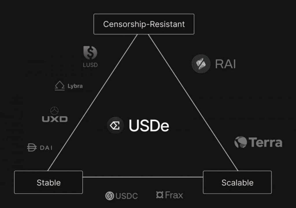 USDe 是由 Ethena Labs 推出的稳定币,旨在解决稳定币的三难困境,实现完全的去中心化。稳定币的三难困境指出,稳定币无法同时实现价格稳定、去中心化和可扩展性。