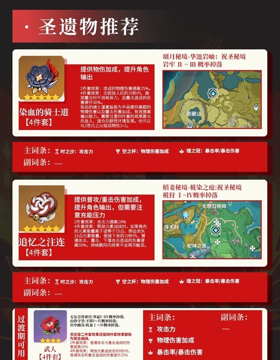 圣遗物推荐: ①骑士4,②追忆4,③武人4(过度)