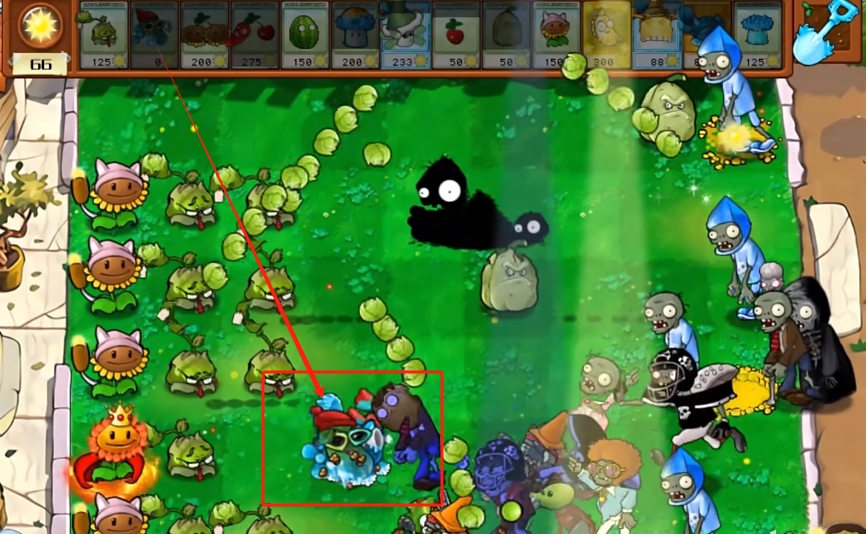 1、种在一个格子上,消灭该格内的所有植物,然后对本行内所有僵尸造成等于该格内植物生命值总和的伤害。