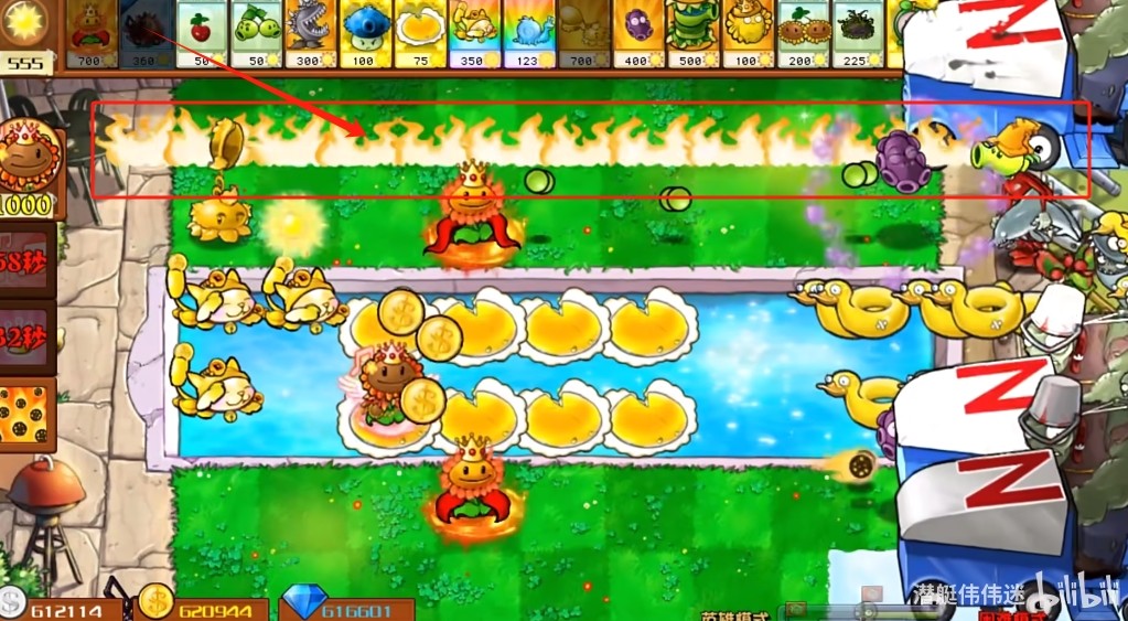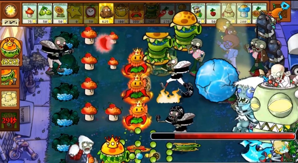 巨大火焰弹:对接触到的所有植物造成2000点巨额伤害,可以被血量≥2000的植物挡下,