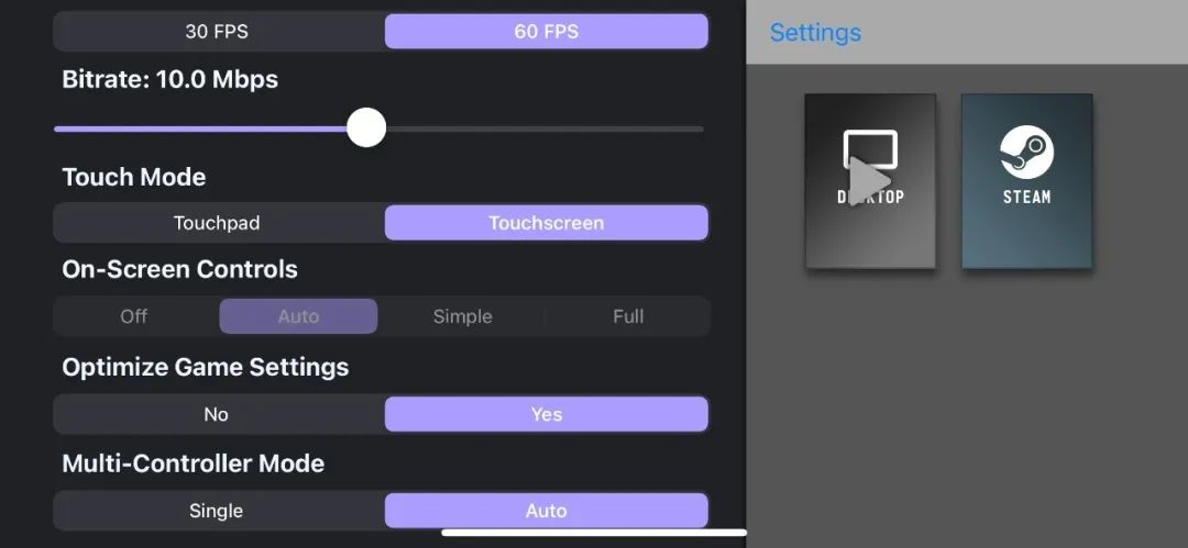3、在iOS上打开Moonlight,连接到电脑上,这个时候显示的画面是有很多控制键。