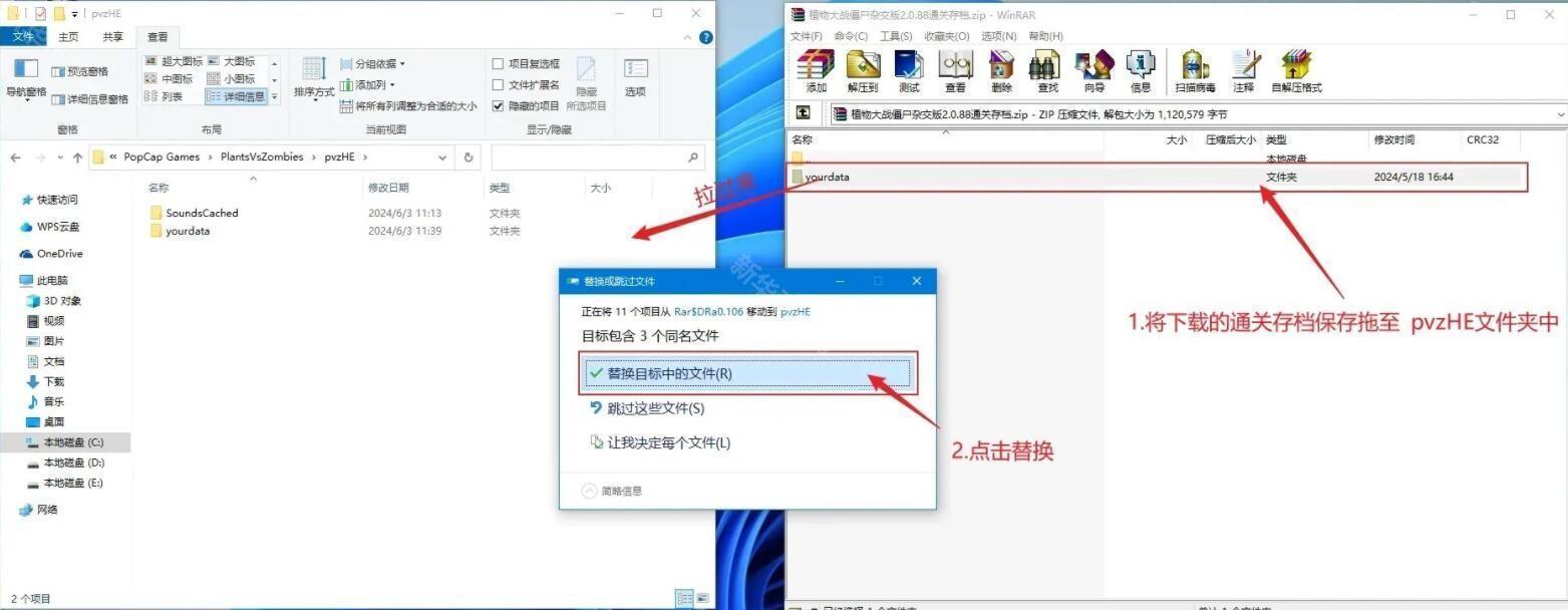 6、把备份好的存档放进pvzHE文件夹中,点击替换即可,如果前面的存档想要保存,可以先备份