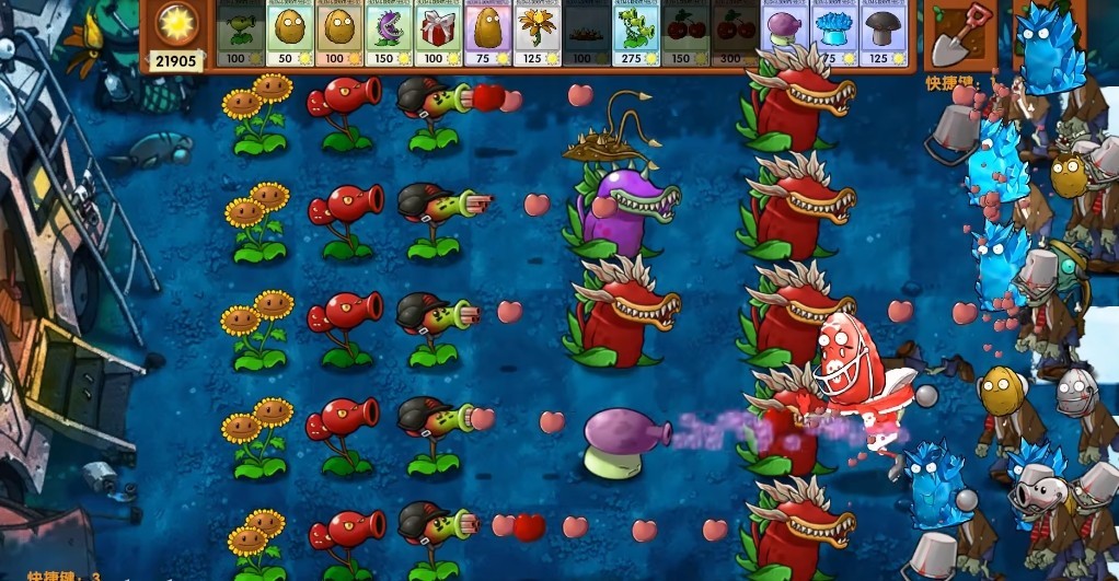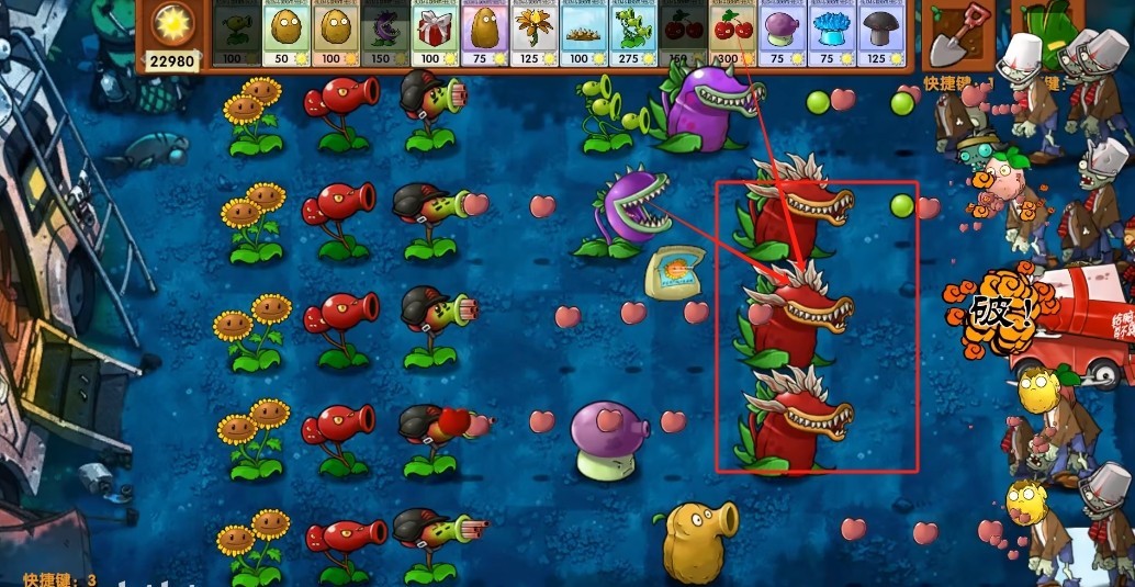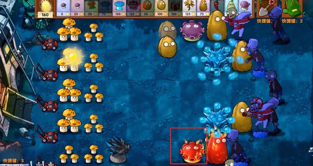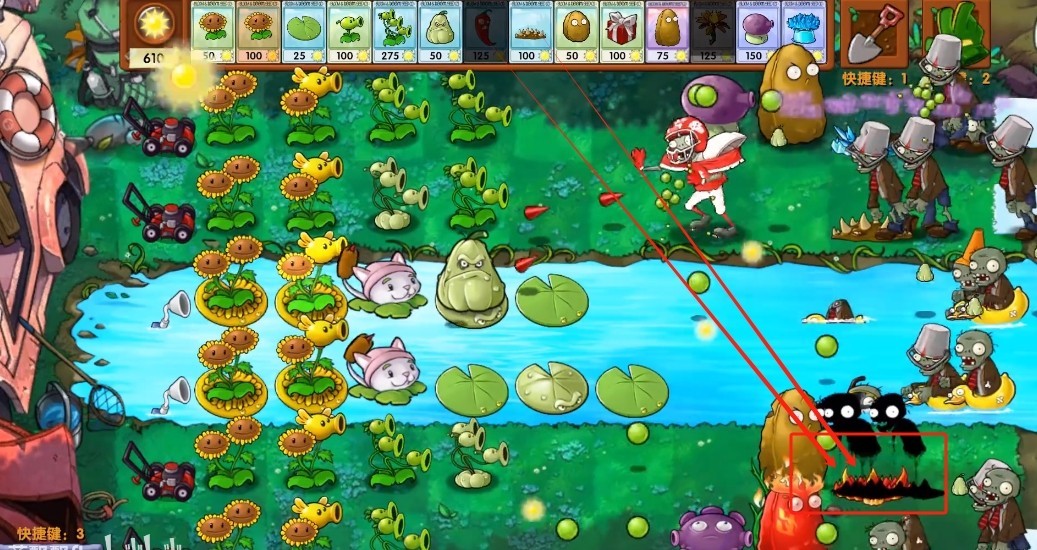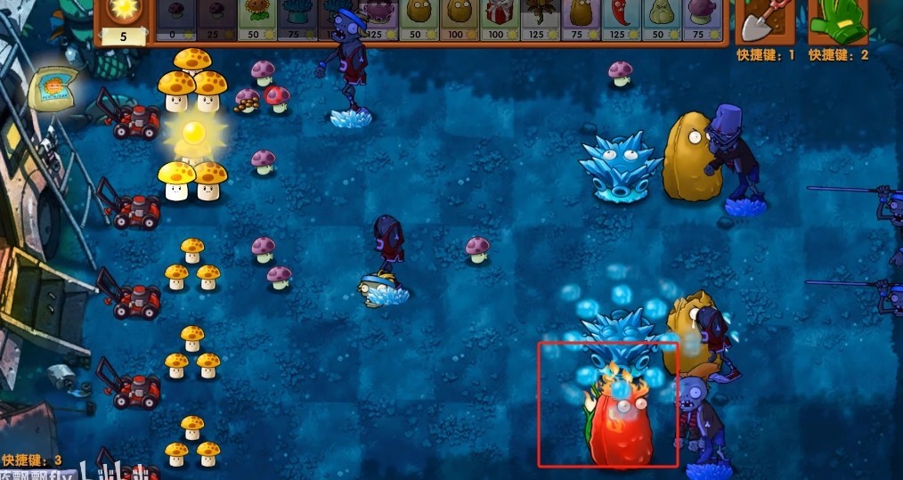 4、究极窝炬不能主动攻击僵尸,但是可以点燃从后排过来的樱桃战神的子弹。