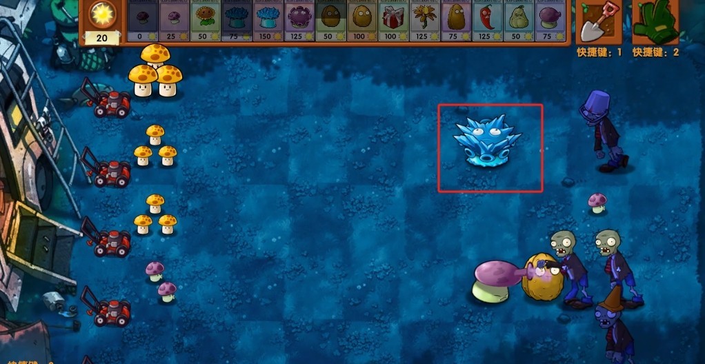 攻击力20*4,攻速1.9秒,攻击附带减速,每次攻击僵尸累计5点冻结值,冻结值满后归零并冻结僵尸4秒,2个寒冰忧郁菇同时攻击即可永冻