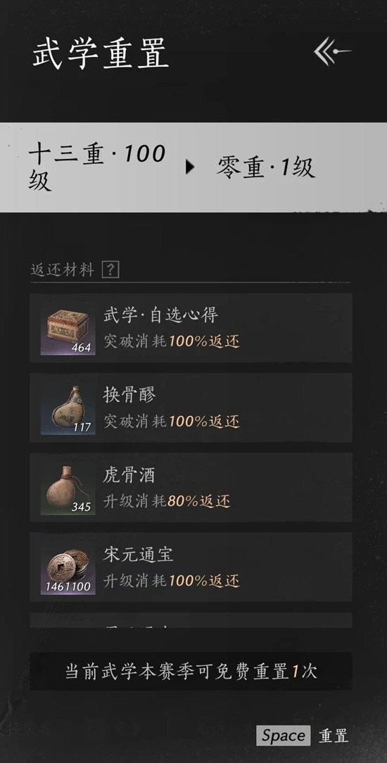 注意开头第一个重置的武学建议为自己用的主武学,留到最后一个养回去