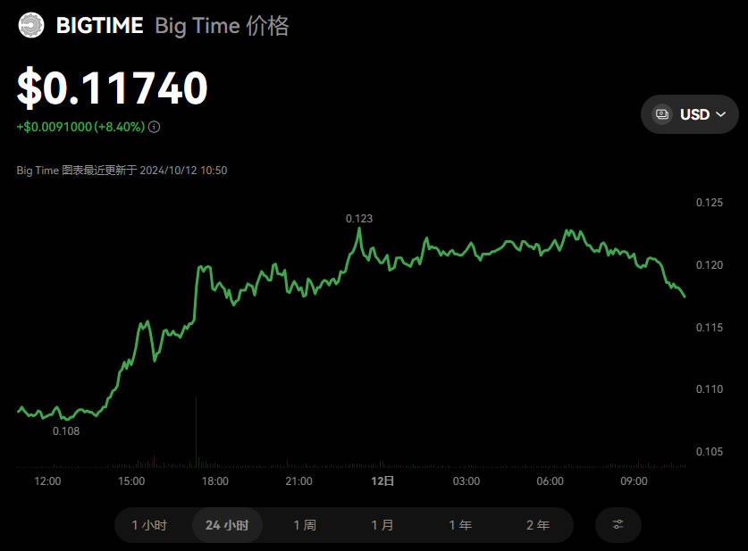 截止目前,BIGTIME 的交易价格为0.11770美元,换算为软妹币为0.83169元。该代币在过去24 小时的价格变化为4.68%,交易量达到$ 105.2M。