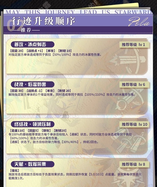 推荐升级:加点需围绕“减防”和“能量循环”展开优先终结技和天赋,战技和普攻次之。