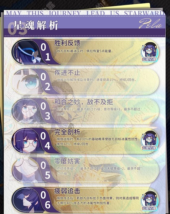 【能量110】【回能5】【群攻】【削韧20】有100%的基础概率使敌方每个单体目标陷入【通解】状态,同时对敌方全体造成等同于佩拉【60%6/100%6】攻击力的冰属性伤害。【通解】状态下,敌方目标防御力降低【30%/40%】,持续2回合。