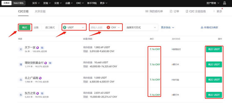4.选择购买,币种选择USDT,根据需求选择合适商家,点击商家右侧的【购买USDT】