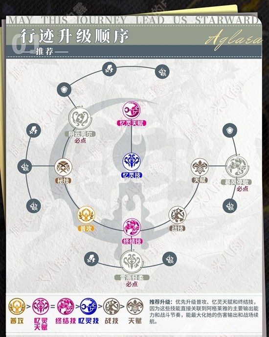 推荐升级:优先升级普攻、忆灵天赋和终结技,因为这些技能直接关联到阿格莱雅的主要输出能力和战斗节奏,能最大化她的伤害输出和战场续航。