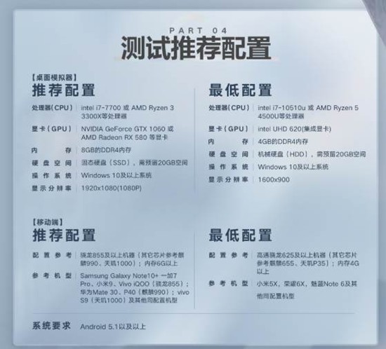 移动端门槛更低,骁龙625/麒麟655/天玑P35配4G内存即可进局,安卓5.1系统保证兼容;推荐配置则建议骁龙855/麒麟990/天玑1000以上芯片配6G内存,机型参考Galaxy Note10+、一加7 Pro、小米9、华为Mate30等,画面更精细,操作跟手度也明显提升。