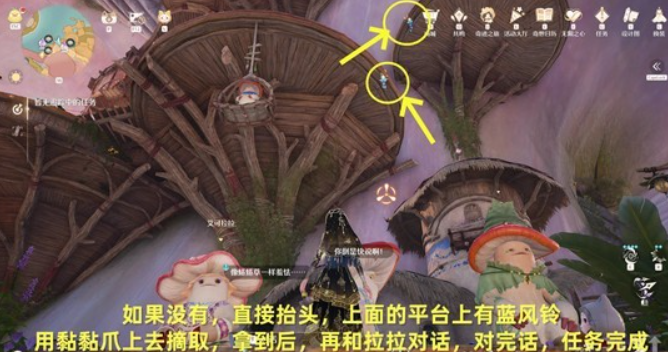 如果没有,往上看,上面的平台上有蓝风铃,可以直接用黏黏爪上去采摘;