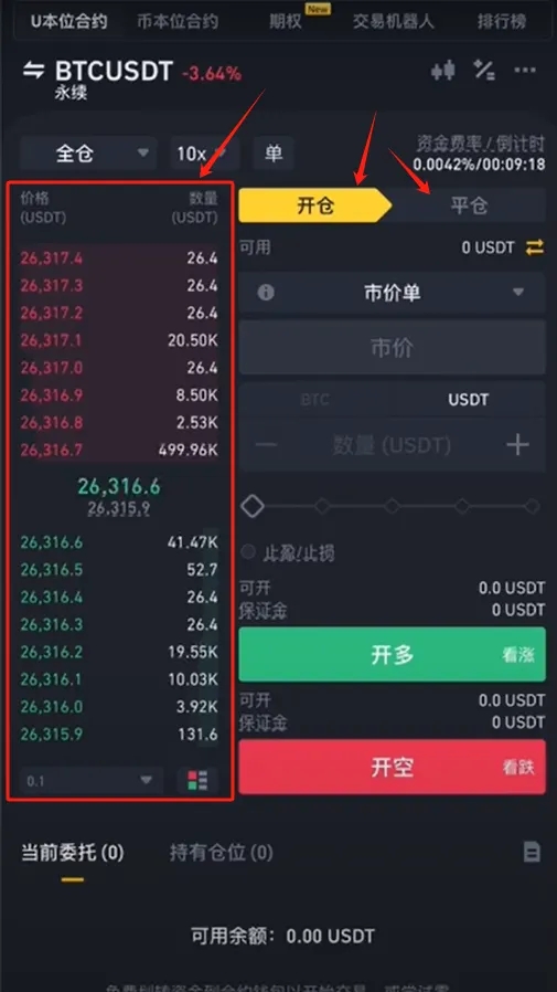 默认进入的是比特币对USDT的永续合约页面。这里我们使用USDT作为保证金,去开比特币的永续合约。