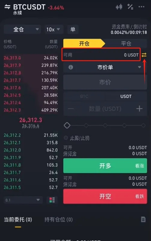 我们可以看到可用余额是0 USDT,说明我这里还没有资金。无论你是刚刚购买还是充值到币安账户,都需要进行资金划转。点击右侧的小箭头,进行资金划转操作。
