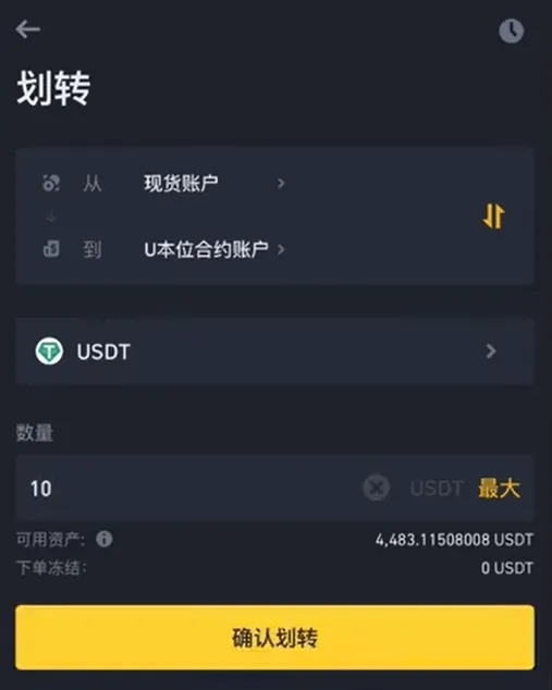 从现货账户转移到U本位合约账户,选择标的为USDT。你可以选择将账户中所有的资金转入,或者输入具体的转账金额。例如,如果我转入了10美元,确认后,现在我的U本位合约账户中就有了10美元。
