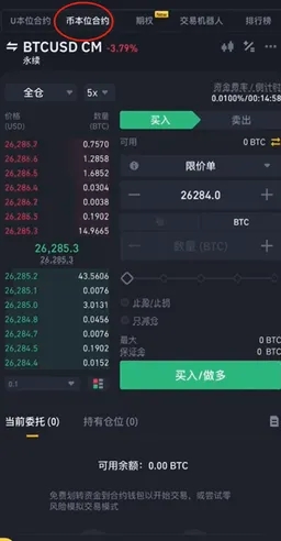 在顶部菜单中,你会看到另一个选项:“币本位合约”。币本位合约(币本位合约)是指使用某种加密货币作为保证金的合约。例如,在BTC/USD的币本位合约中,我们使用BTC作为保证金,赚取和亏损的也是BTC。