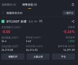我可以看到我的持仓信息,系统显示的强平价格是16,391美元。这意味着如果比特币价格跌到这个价格,系统将会强制平仓我的头寸,也就是我会爆仓。由于我使用的是全仓保证金,我的账户里的10美元将会全部损失。