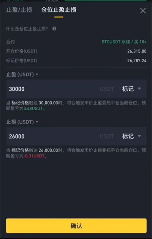 我可以设置一个止盈价格,比如设置在3万美元,以及一个止损价格,比如设置在26,000美元。系统会自动计算出当价格达到这些设置价格时,我会赚取多少利润,或者会有多少亏损。
