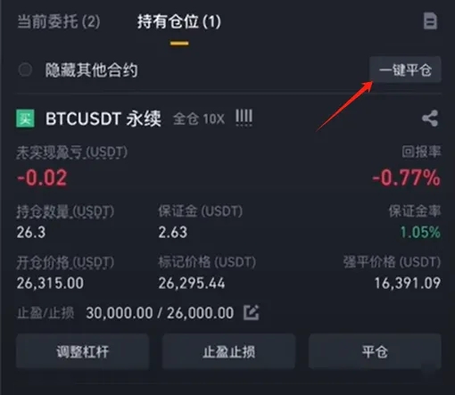 点击右上角一键平仓 ,他会自动平掉所有的合约仓位,并且撤销所有的止盈止损自动挂单。