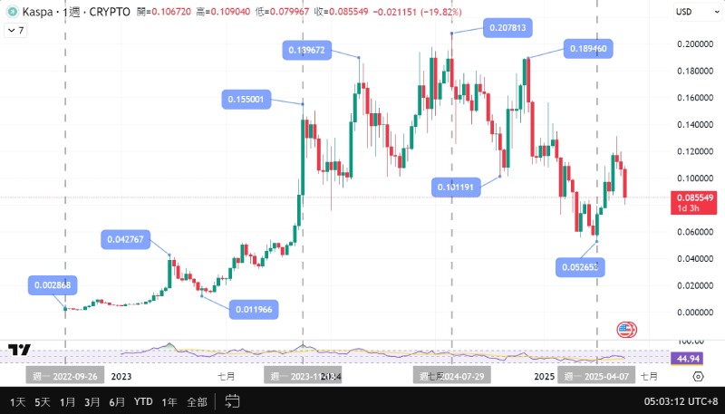 2025 年4 月初Kaspa 跌至阶段性低点0.0526 美元,为近一年新低,反映市场风险偏好转弱与投资信心测试。
