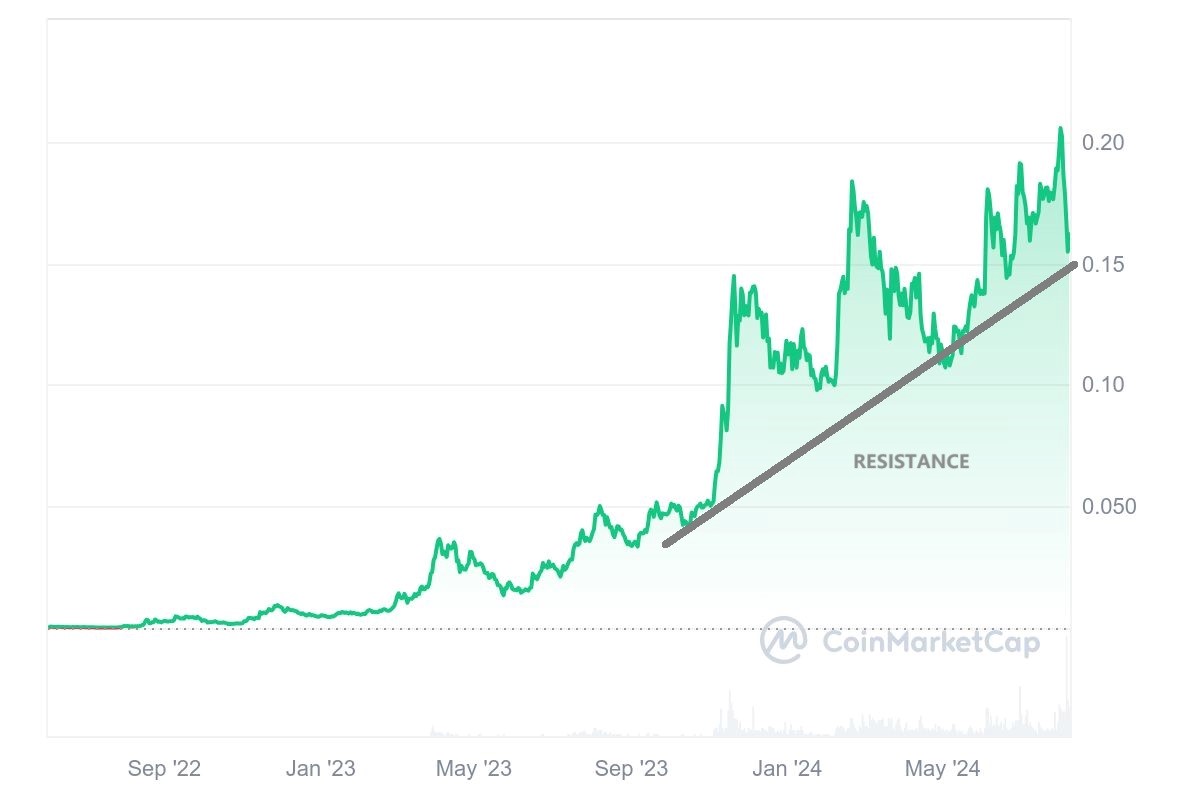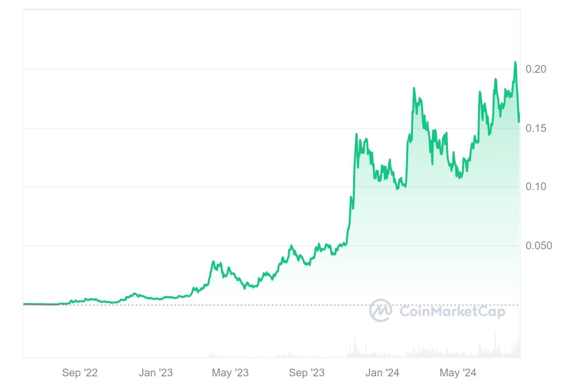2022年,kas币在2021年上线主网,2022年开始获得市场的关注,价格缓慢而逐步地上升,但一直不曾突破过$0.006的水平。2023年,2023年年初在KuCoin等主要交易所的上线增加了kas币的流动性和知名度,kas币价格显著上升。而GHOSTDAG协议的升级改进和新合作伙伴关系的创建支撑了价格的持续上升。到了2023年11月,Kaspa终于在Binance交易所上线。这一事件在24小时内使Kaspa的价格飙涨了15%,交易量也同步大幅增加。登录Binance标志着虚拟货币板块对Kas币的广泛认可。2024年,随着比特币现货ETF的获批,Kaspa也搭上了虚拟货币牛市的东风,迎来了明显的两波上涨。第一波发生在2024年2月,kas币的价格从约$0.1的水平飙升到了最高$0.1837,随后打开回调。第二波从3月初启动,价格从月$0.11的水平一路上涨到了突破$0.2,截止8月初Kaspa的价格稳定在了$0.15左右的水平。而与此同时比特币等传统加密货币价格却不断走低。