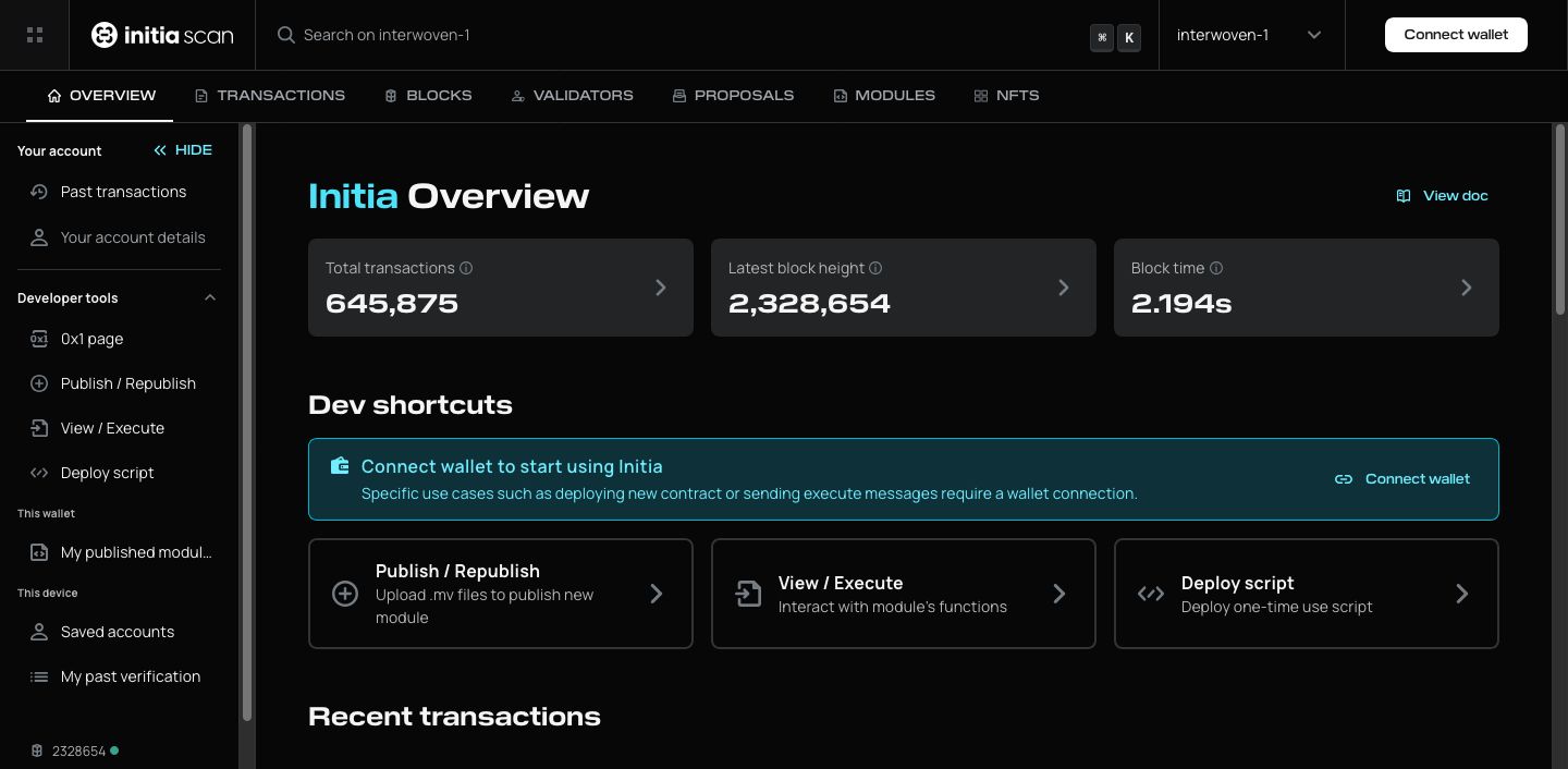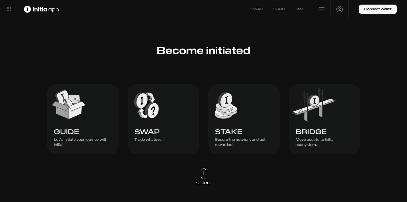 Initia 应用程序是与 Layer 1 和 Minitia 服务进行交互的官方网络界面。该平台集成了资产管理、验证者质押、去中心化交易及治理参与等功能工具。应用程序支持通过内置于 Layer 1 的去中心化交易所 InitiaDEX 进行基于 INIT 的代币交换。用户可为特定交易对提供流动性,并获得 LP 代币,这些代币在既定流动性模型下同样可用于质押流程。