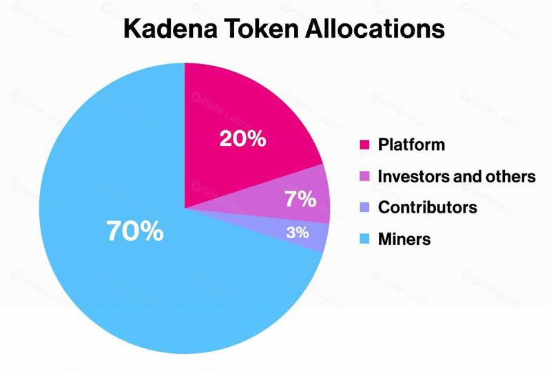 Kadena 进行了多轮 KDA 预挖旷。KDA 代币的初始分配是通过私人及公开发售以及代币交换活动进行的。实施代币分配用于促进网络增长、激励参与,并维护健康的生态系统,具体分配为:70%给矿工、20%用于储备金、7%给种子/投资者,以及3%给开发者。矿工获得最大份额的供应和未来释放量,因为他们负责保障 Kadena 区块链的安全。