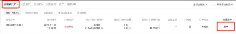 13、选择账户模式、委托类型,输入价格、数量,点击买入开多(看涨)或卖出开空(看空)。未成交的委托挂单可单击撤单撤销委托。此处以开空为例。