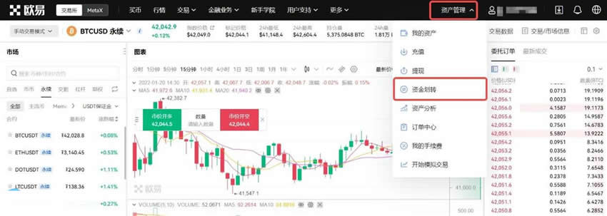 12、永续合约分为USDT保证金永续合约,币本位保证金永续合约,这里以USDT保证金永续合约为例。同样,将我们的数字资产从资金账户划转到交易账户,如已完成则无须进行额外划转操作。