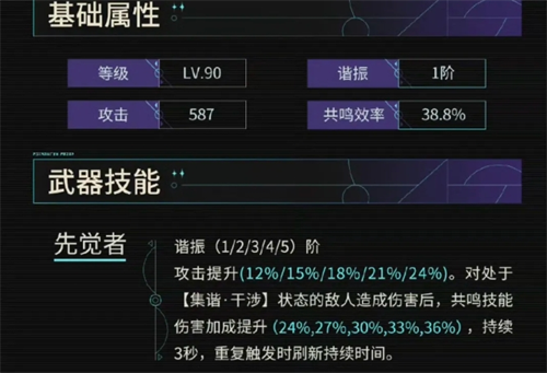 主属性加共鸣效率。对处于“集谐·干涉”状态的敌人造成伤害后,共鸣技能伤害加成提升24%(最高可叠至36%),持续3秒,重复触发时刷新持续时间。